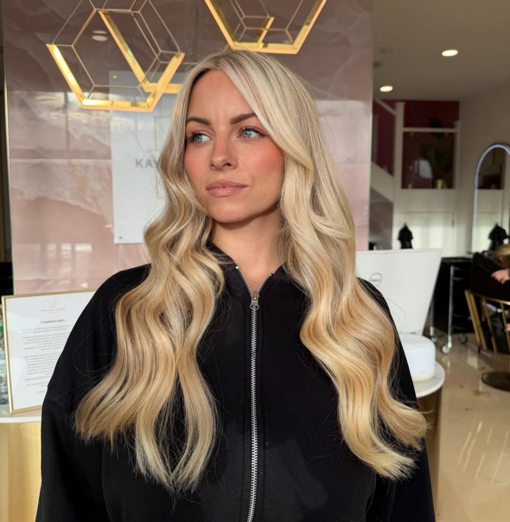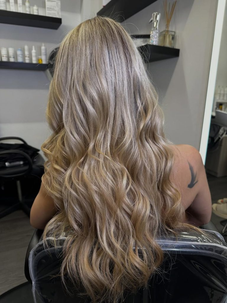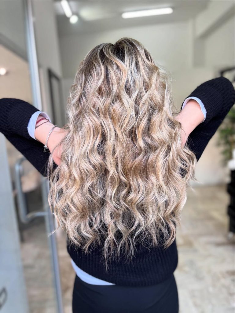 This look has personality—and plenty of it. The textured waves combined with Balayage and visible Dark roots give the hair a relaxed, lived-in feel that still looks intentional. It feels modern, slightly playful, and very wearable, especially for spring. There is depth here, which makes the blonde feel richer and more dimensional than a flat or overly bright one.