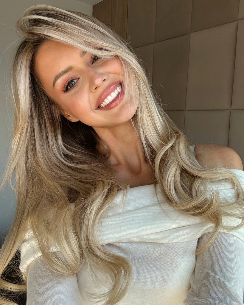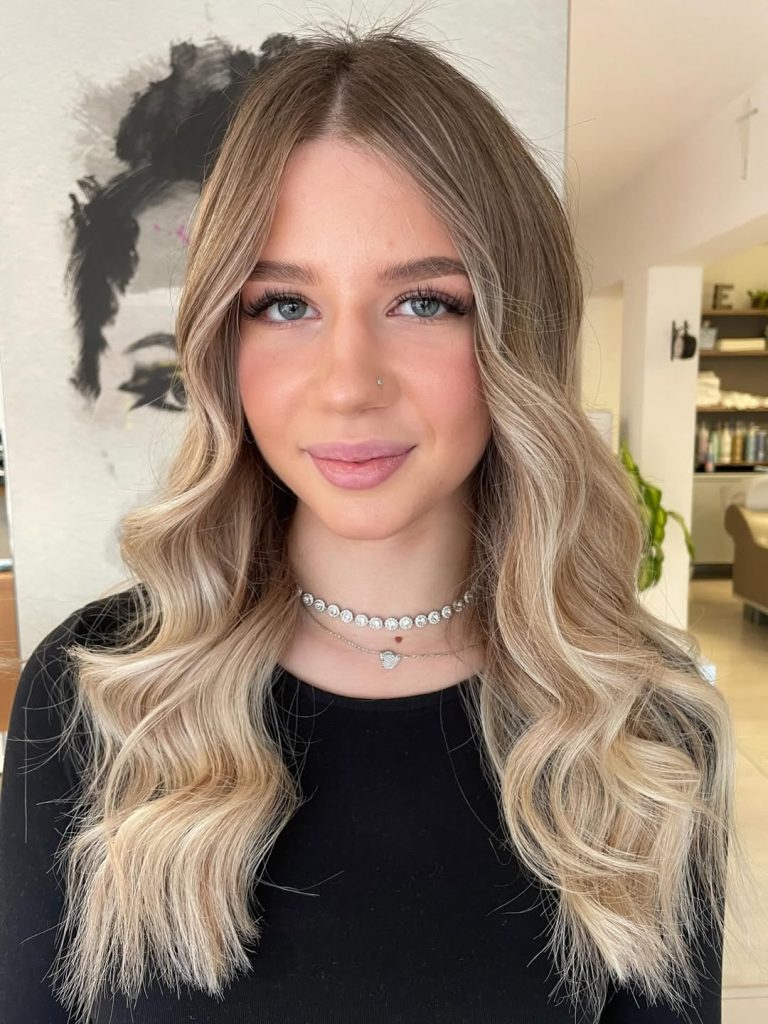 There’s warmth and comfort in this blonde that feels incredibly wearable. The medium-length cut, paired with Balayage caramel highlights, gives the hair dimension without overwhelming it. It feels approachable, flattering, and quietly elegant—perfect for women who want Color ideas that enhance rather than transform. This blonde looks great at brunch and formal dinners.