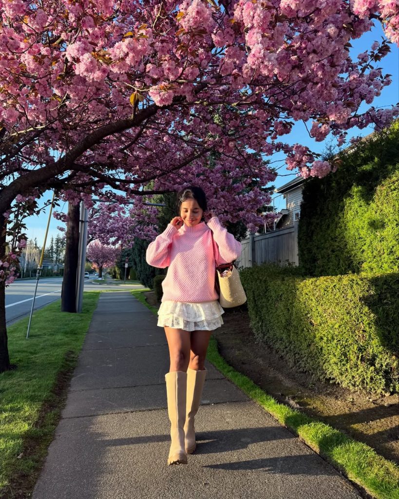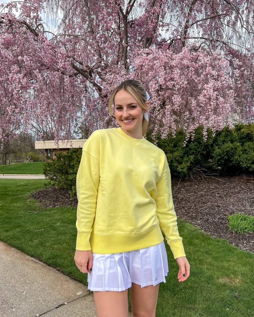 A pastel yellow sweatshirt paired with a crisp white pleated mini skirt captures spring’s lighthearted energy in the most wearable way.