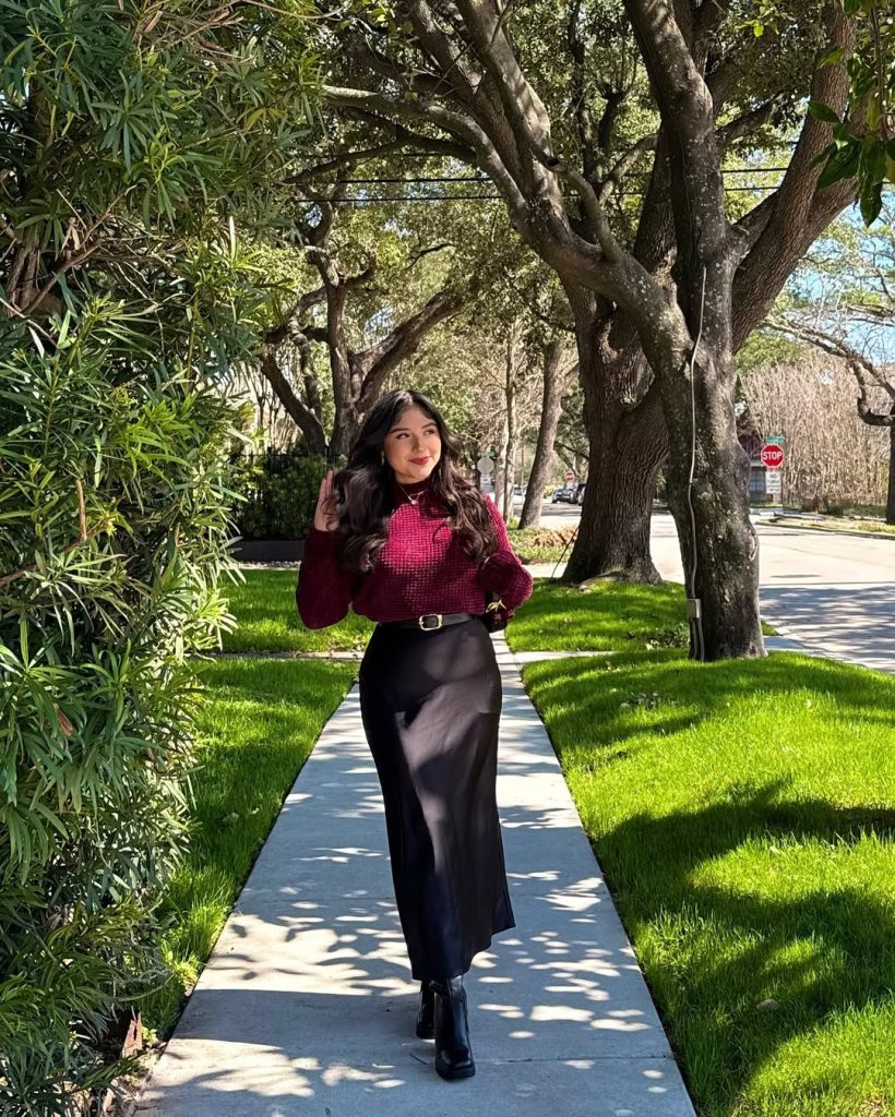 A flowing black maxi skirt paired with a burgundy knit top creates a striking yet wearable contrast.