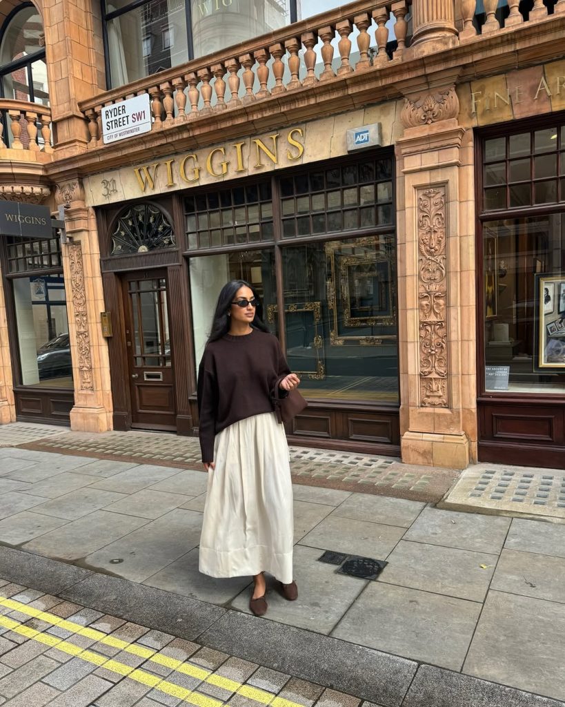A rich brown knit sweater styled with a flowing cream maxi skirt creates a grounded, elegant silhouette with a distinctly European feel.