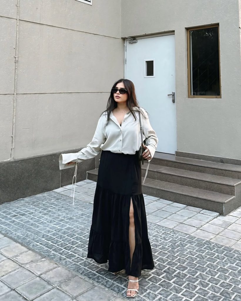 A flowing black maxi skirt with a front slit paired with a soft satin shirt creates a look that balances strength and softness.