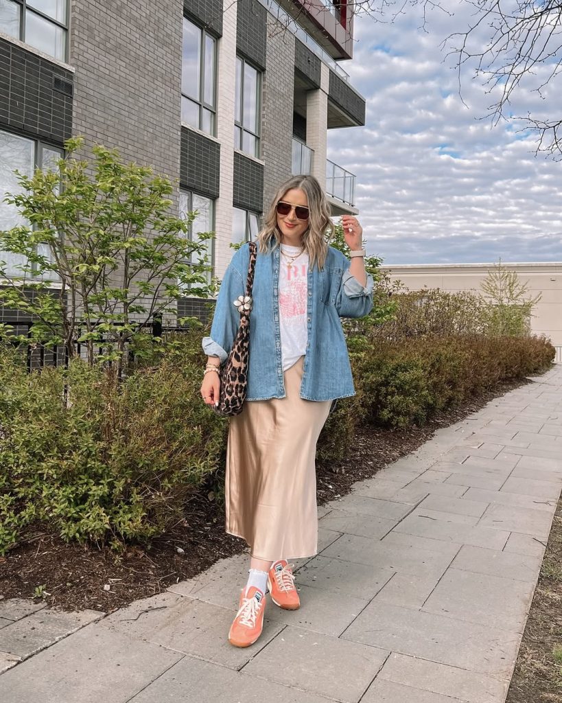 A champagne-toned satin maxi skirt paired with an oversized denim shirt delivers a laid-back yet polished everyday look.