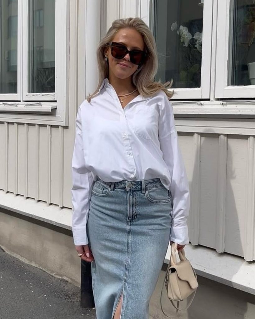 There’s something quietly powerful about a perfectly cut white shirt paired with a denim midi skirt—it feels timeless, confident, and refreshingly uncomplicated.