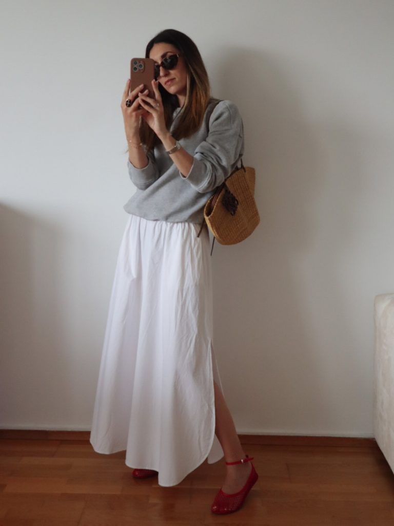 Soft grey knitwear layered over a flowing white maxi skirt creates a calm, almost poetic silhouette—simple, balanced, and deeply wearable.