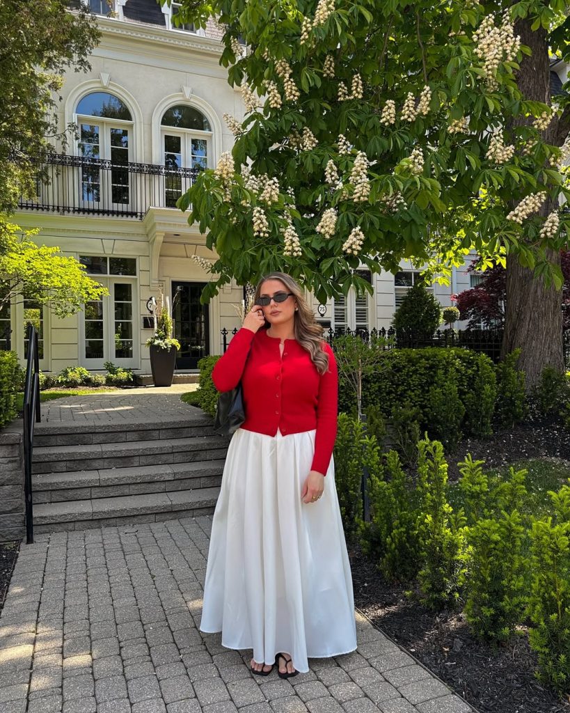A red cardigan layered over a flowing white maxi skirt brings warmth and confidence while keeping the look approachable and refined.