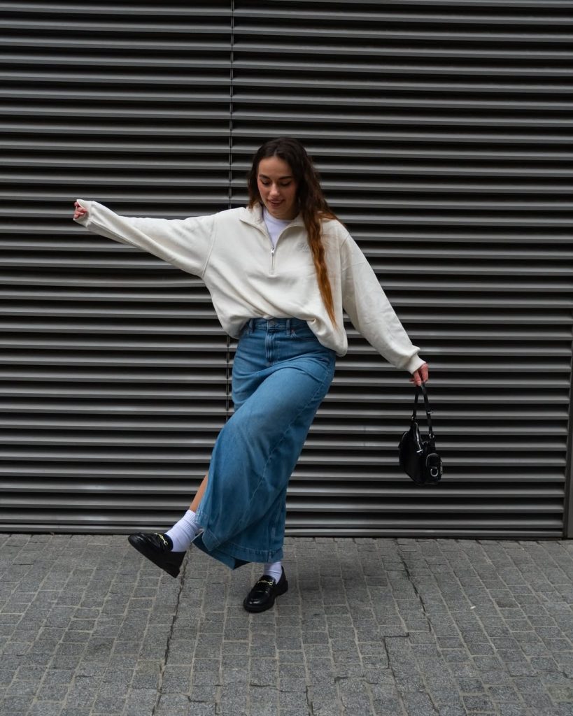 A flowing denim maxi skirt paired with a quarter-zip pullover brings relaxed energy to everyday spring dressing.