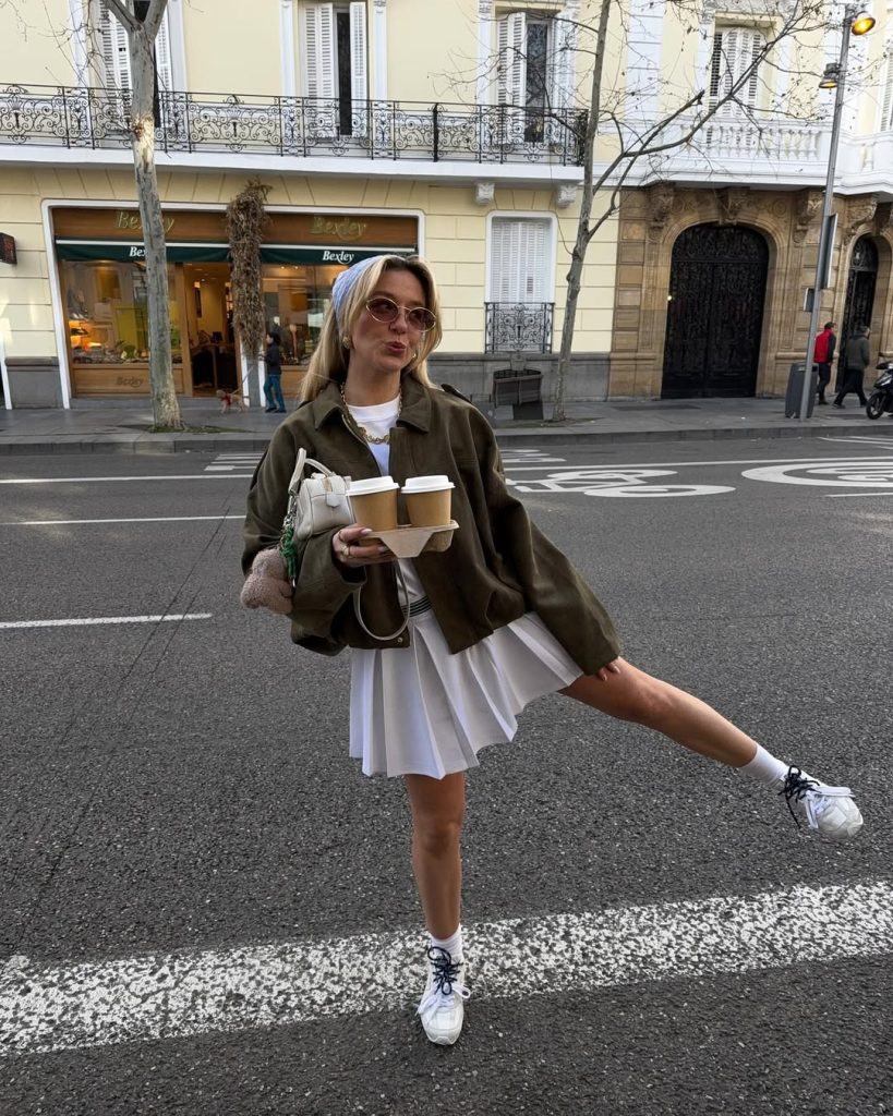 A crisp pleated white mini skirt paired with a relaxed jacket and sneakers captures playful spring energy with an urban, lived-in feel.