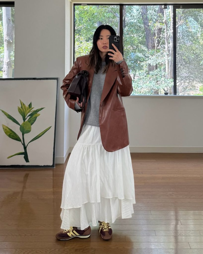 A flowing white tiered maxi skirt paired with a structured leather blazer creates a refined balance of softness and authority.