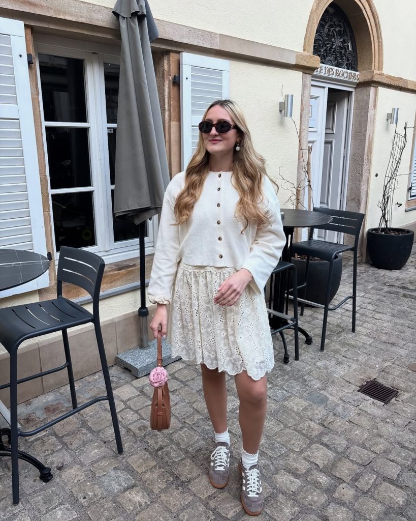 This ensemble seamlessly blends casual, cute, and sporty elements, making it ideal for coffee runs, city walks, or travel days. The pleated skirt adds movement, while sneakers ground the outfit for all-day comfort. Keep accessories minimal and avoid bulky layers to preserve the light aesthetic. This outfit exemplifies the relaxed 2026 trends that draw inspiration from European street style.