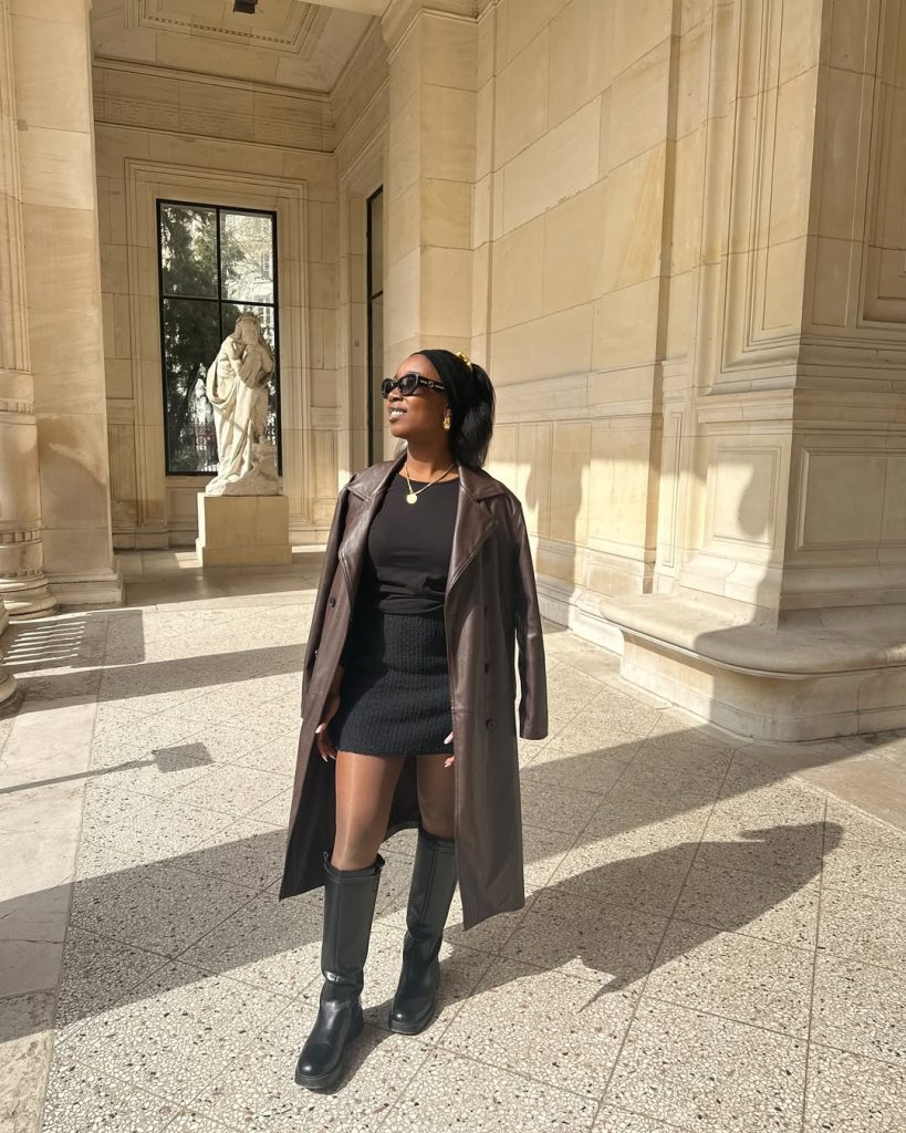 A fitted black mini skirt layered with a long leather coat creates a striking silhouette rooted in confidence and clean lines.