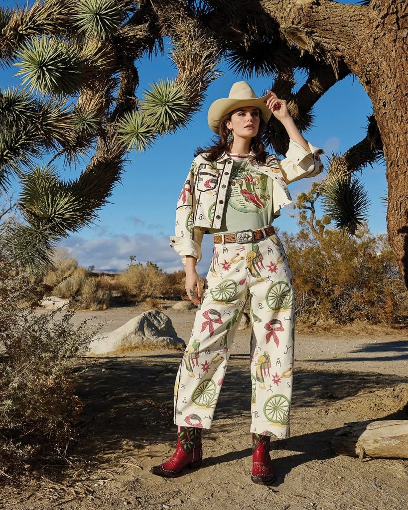 A coordinated cream set with bold Western illustrations creates a playful yet polished cowgirl mood for 2026.
