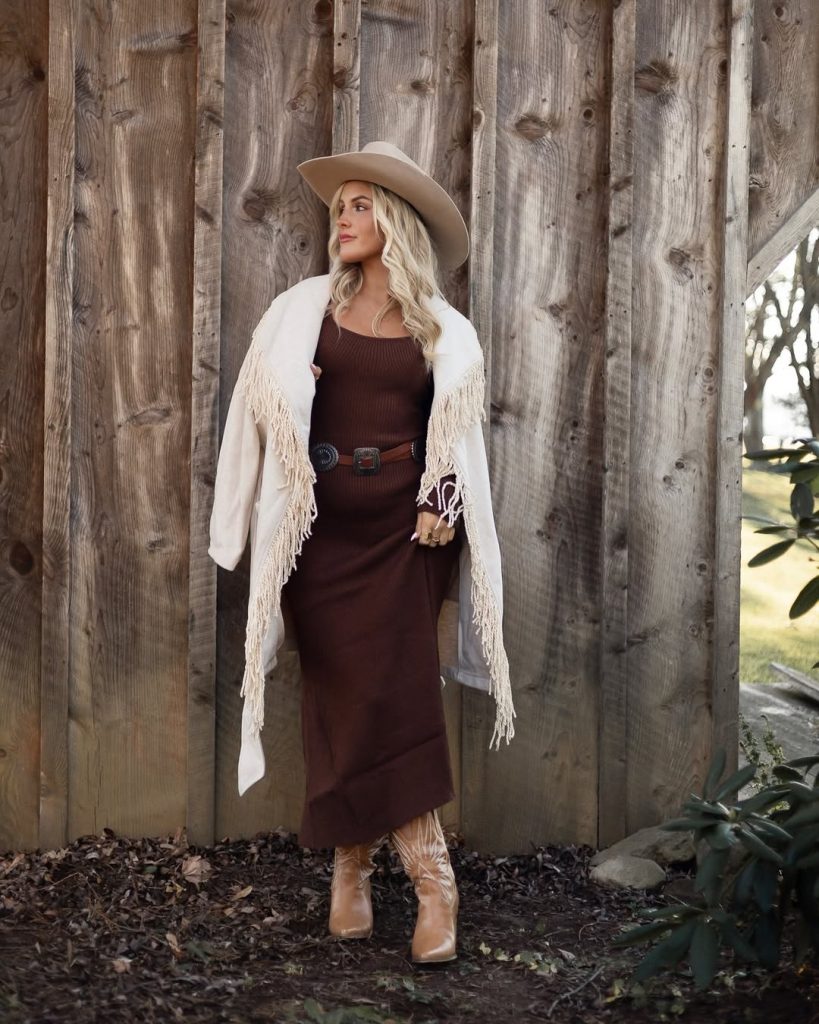 This outfit looks like something straight out of a mountain retreat—quiet, warm, and full of character. The detailed knit gives a subtle Boho spirit while staying modest and classic. Add personality with a concho belt or turquoise studs. Avoid bright outerwear that competes with the embroidery. Perfect for cool mornings, ranch visits, or cozy fireside gatherings after a long day outdoors.
