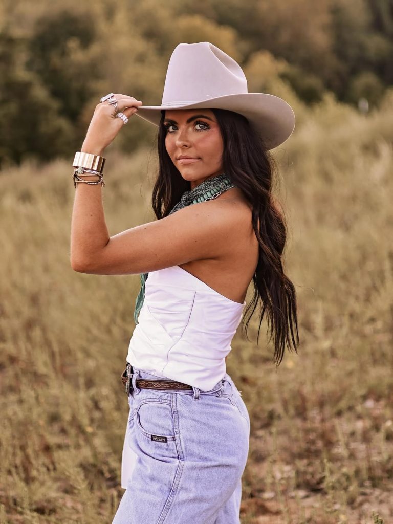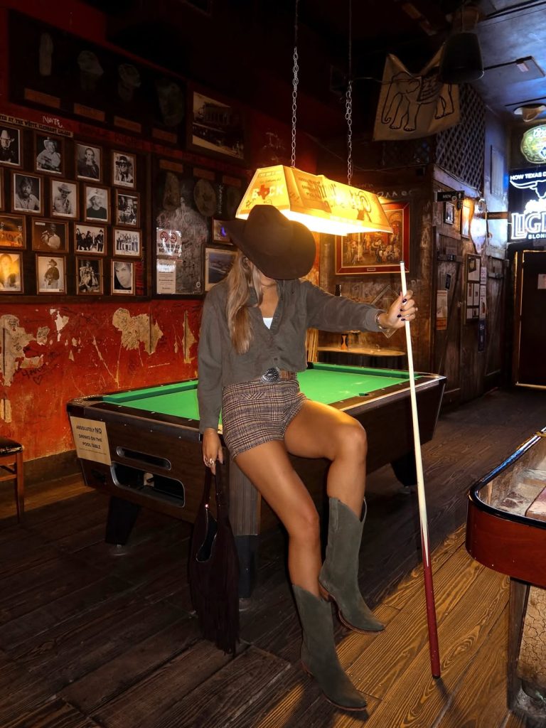 This style captures the spirit of late-night honky-tonks—dim lights, good music, and a little mischief. The look is bold without trying too hard, offering perfect inspo for women who enjoy playful Western pieces. To personalize, add a vintage belt buckle or turquoise cuff. Avoid oversized outerwear; the charm lies in the leg-boot combination. A great pick for bar hopping, dance halls, or date nights with Western energy.