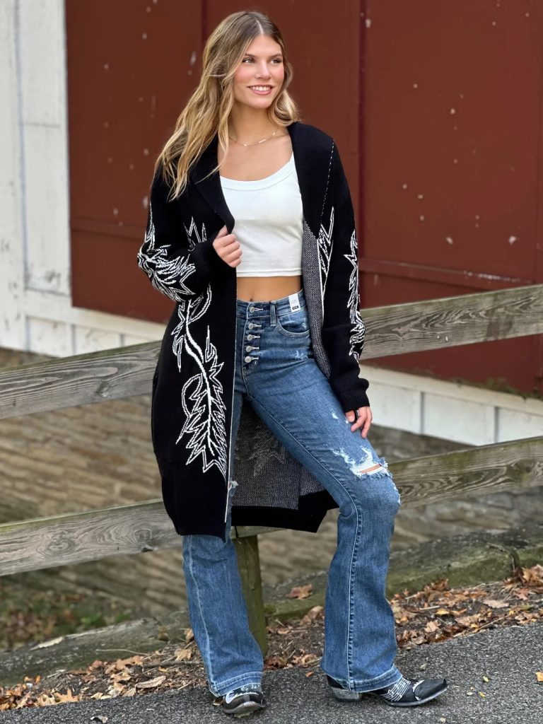 A long black cardigan with white embroidery elevates a simple crop-and-denim outfit into a stylish women’s casual Western look.