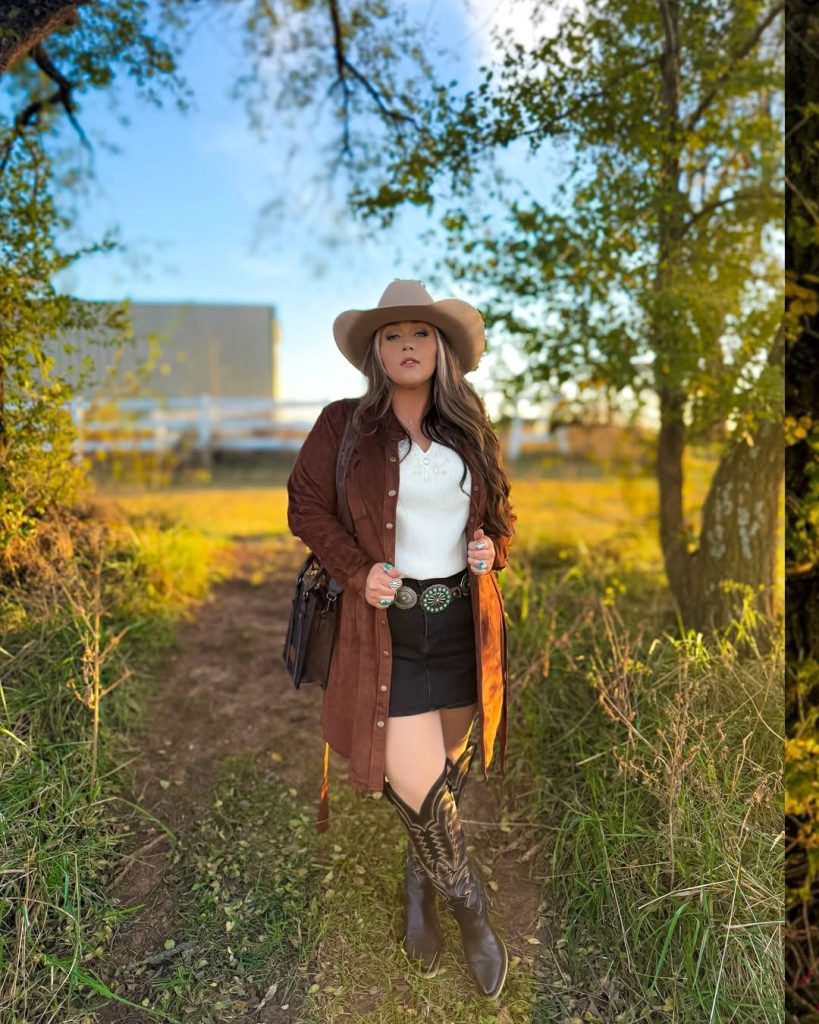 A warm suede duster paired with a black mini skirt creates a rich, sunset-toned country look with personality.