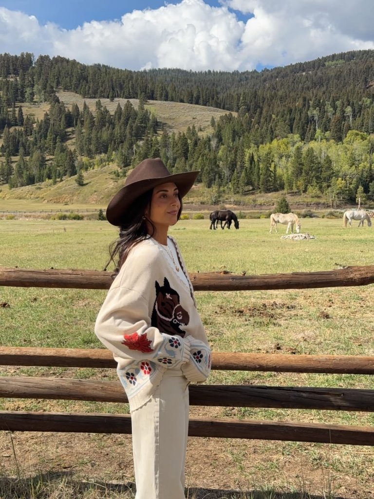 A cozy embroidered sweater and cream jeans deliver a soft, pastoral, Western women’s winter style with storytelling charm.