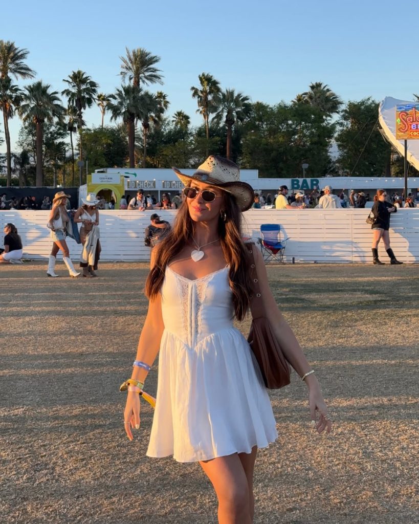 A breezy white mini dress and straw Western hat create the ultimate women’s summer festival outfit—light, fun, and cute.
