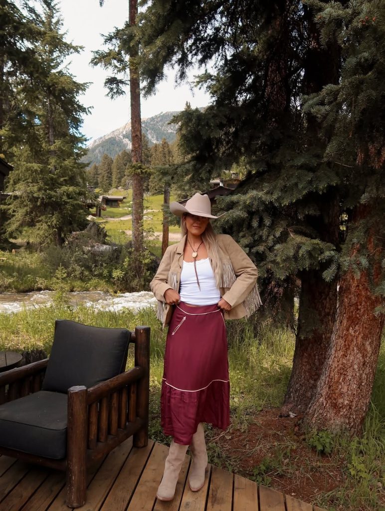 A flowing burgundy skirt paired with a fringe jacket blends rustic tones with relaxed, elegant Western appeal.