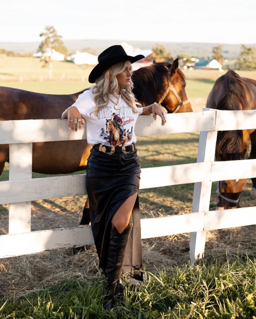 A bold statement graphic beige western tee paired with a sleek, structured black high-slit midi leather skirt with tall shiny black western cowgirl boots fused together creates a striking silhouette. The result is a funky and modern cowgirl style.