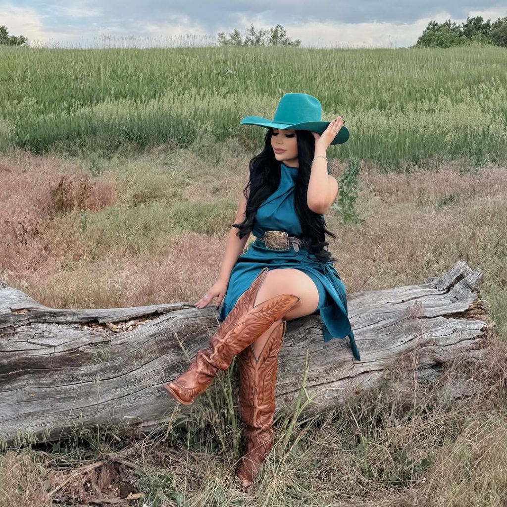 A flowing teal dress and tall chestnut boots combine for an expressive, softly dramatic, elegant Western silhouette.