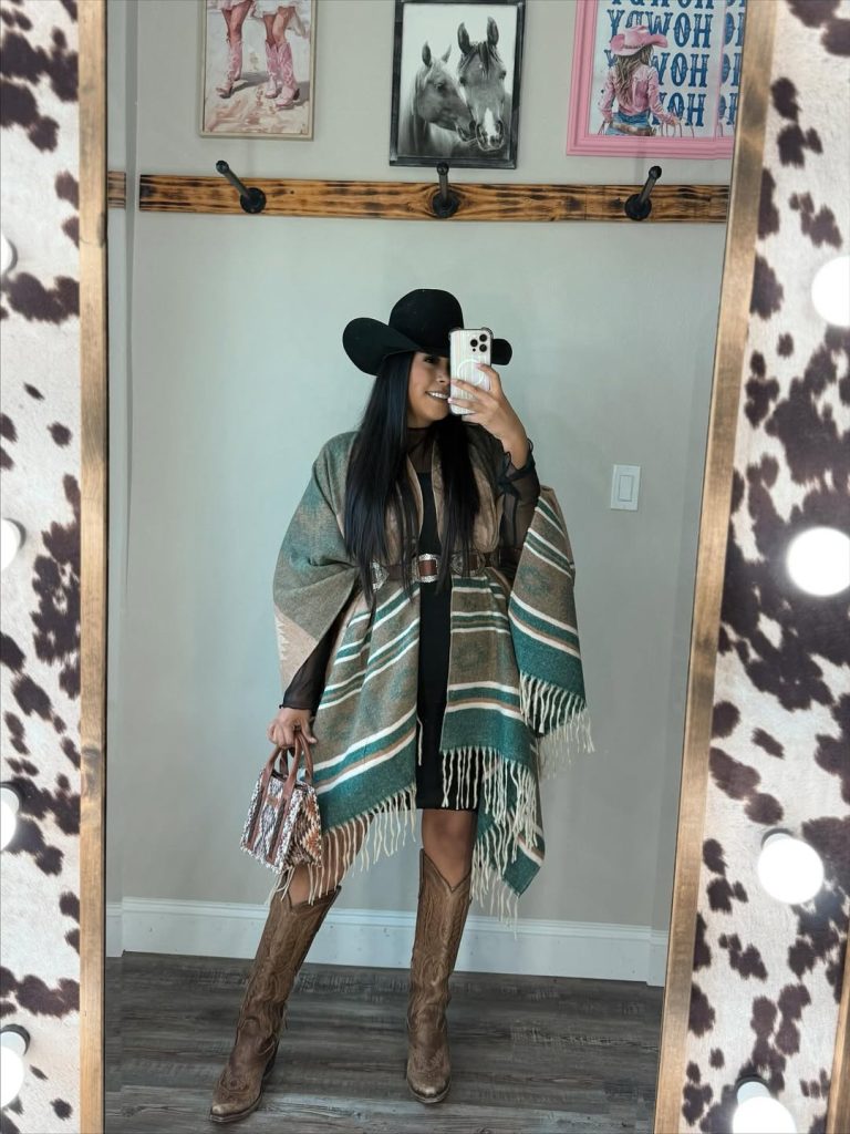 A striped poncho with earthy tones sets the stage for a warm, country-inspired outfit that blends comfort and artistry.