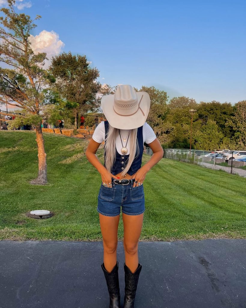This outfit captures the playful charm of cute rodeo dressing—something I see often at summer fairs where denim reigns supreme. It feels casual but styled with intention, especially with the pendant adding movement. To elevate, throw on a light boho kimono or stack a few silver rings. Avoid bulky jackets; the clean waistline is part of the appeal. Perfect for concerts, small-town festivals, or golden-hour strolls before the evening show begins.