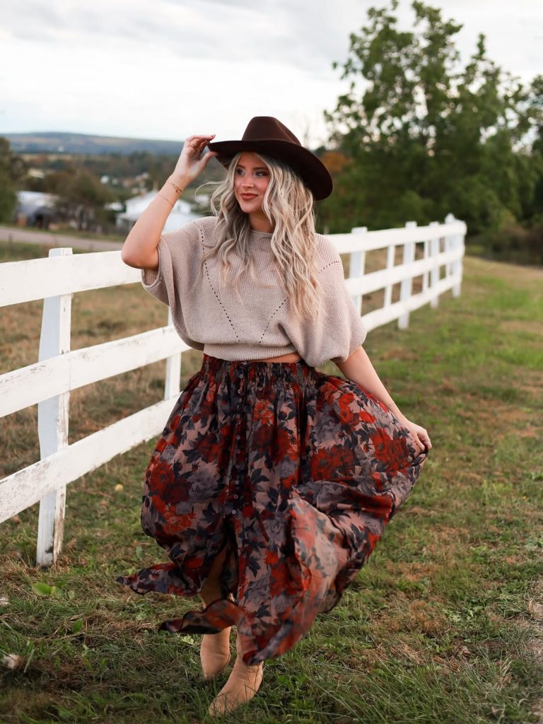 A breezy, romantic pairing of a beige knit top and a floral maxi skirt, ideal for women who love soft country elegance.
