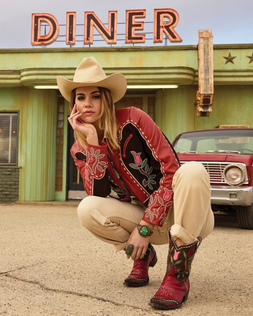 A bold red-and-black embroidered jacket paired with matching boots delivers a punchy, expressive take on modern Western style.
