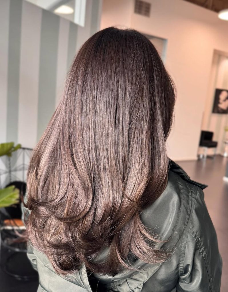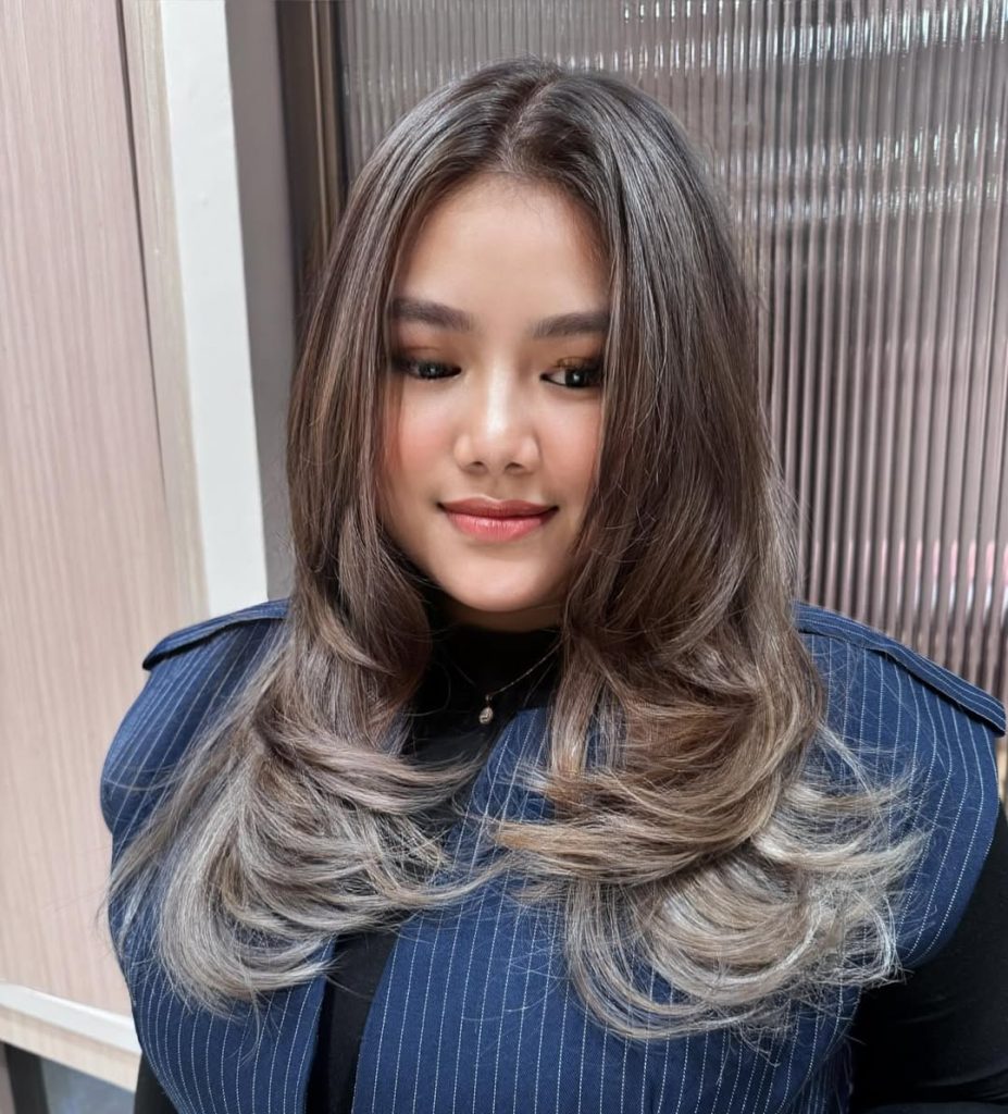 If you’re someone who wants versatility, this cut delivers. It works especially well for women with straight to slightly wavy textures who want shape without losing length. A subtle Balayage placement through the lower layers adds dimension and keeps the color from appearing flat. Blow-dry with a round brush, flipping the ends outward slightly to highlight the layered flow and Soft shine.