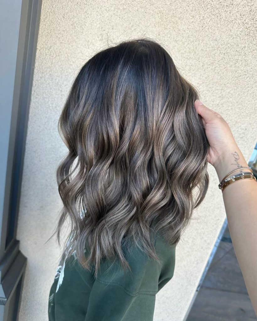 15. Ash Brown Balayage with Silver Highlights and Natural Waves