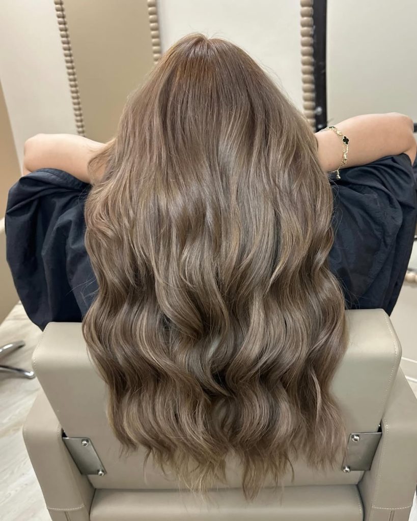 This 2026 interpretation of ash brown hair leans slightly lighter, with silver highlights woven through a soft, cool base. The overall effect feels breezy and contemporary, almost beach-inspired but still polished. There’s movement in every wave, and the Light strands give the Color a luminous, dimensional aesthetic that feels elevated yet relaxed.