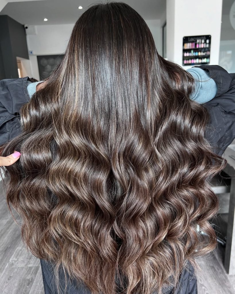 This ash brown hair 2026 look plays with depth in the most flattering way. A rich brunette base is lifted with Soft Balayage brunettes placement, adding Light ribbons throughout the lengths. The waves amplify the dimension, giving the Color a dynamic, almost sculpted effect. It feels vibrant, but it is still grounded in a natural, wearable tone.