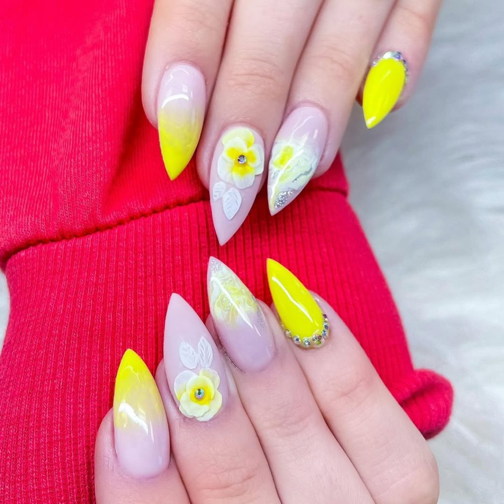 1. Sunny Yellow Almond Nails with Floral Art