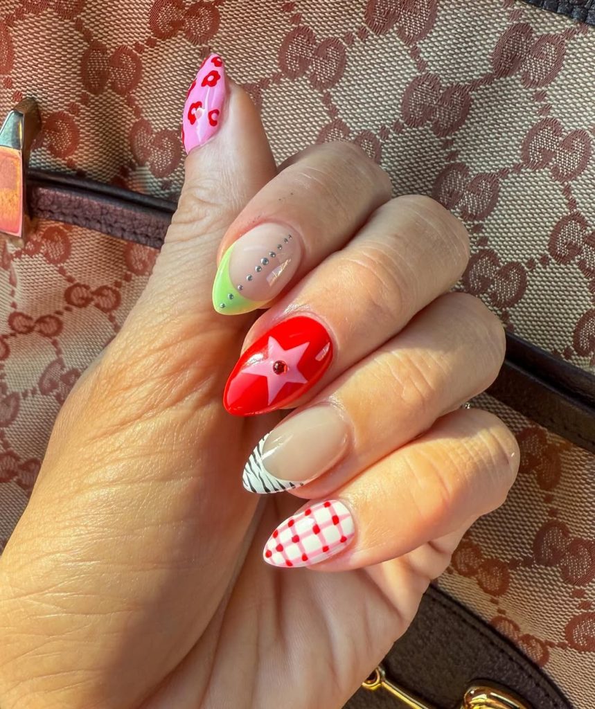 10. Eclectic Almond Nails with Stars, Patterns, and Bright Accents
