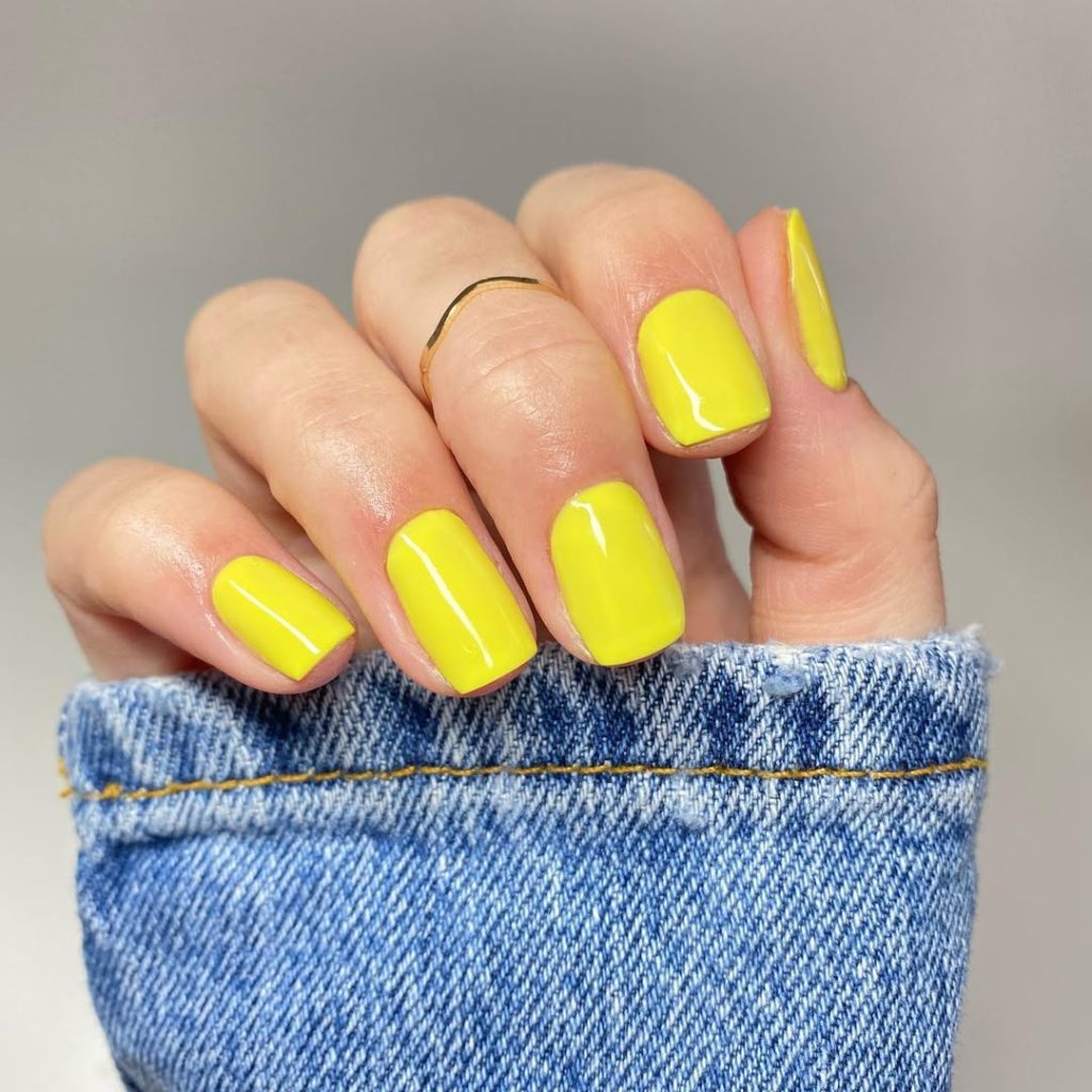 11. Bright Yellow Square Nails with a Clean Gloss Finish