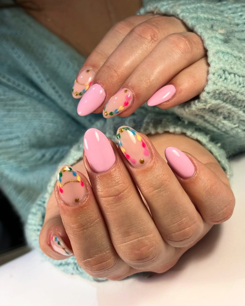 12. Soft Pink Almond Nails with Colorful Abstract Details