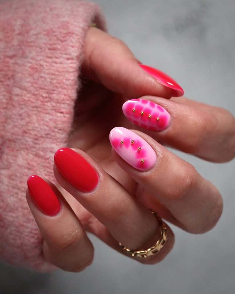 This look carries a romantic edge with a modern twist. The contrast between vivid red and soft pink feels bold yet balanced, while the tiny gold accents add just enough sparkle to catch the light. It’s expressive, confident, and perfect for anyone who loves a manicure that feels a little special without being overdone.