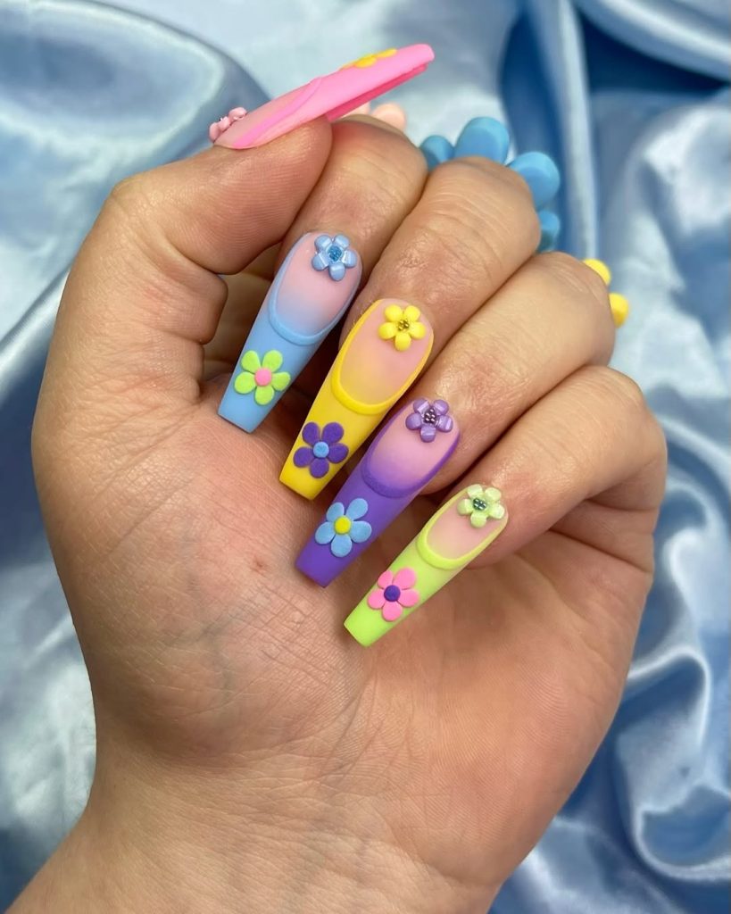 17. Long Square Nails with Colorful Flowers and Pastel Layers