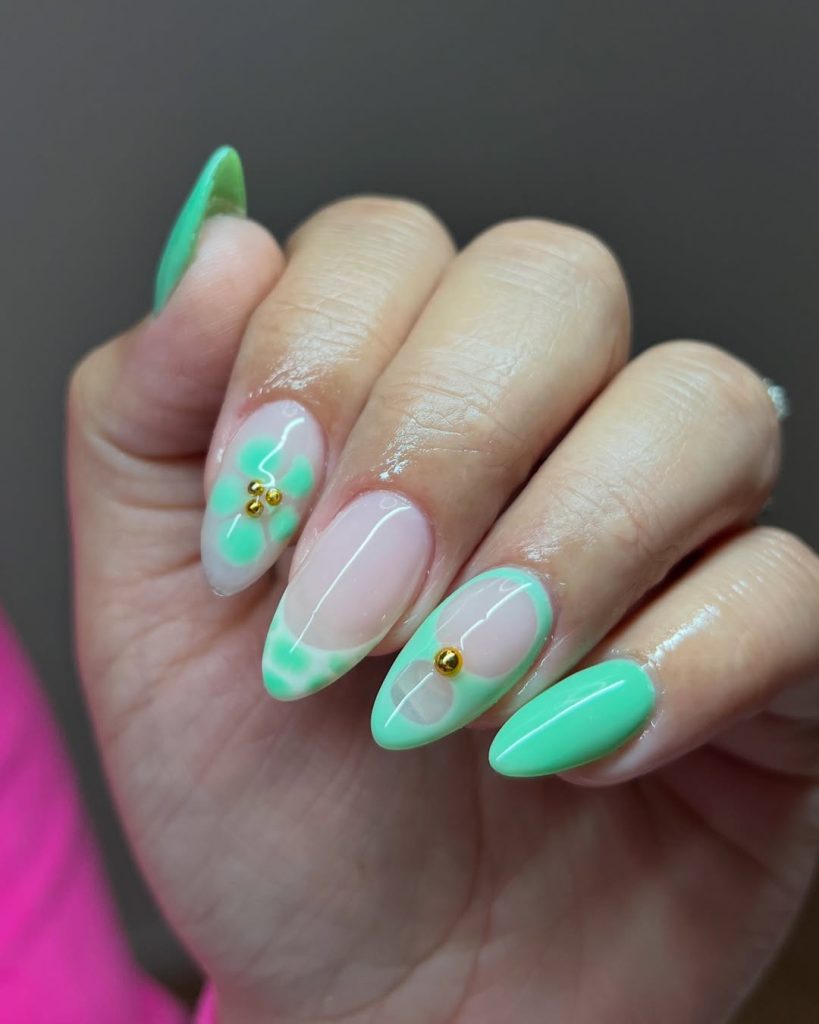 5. Green Almond Nails with Pink Flower Art