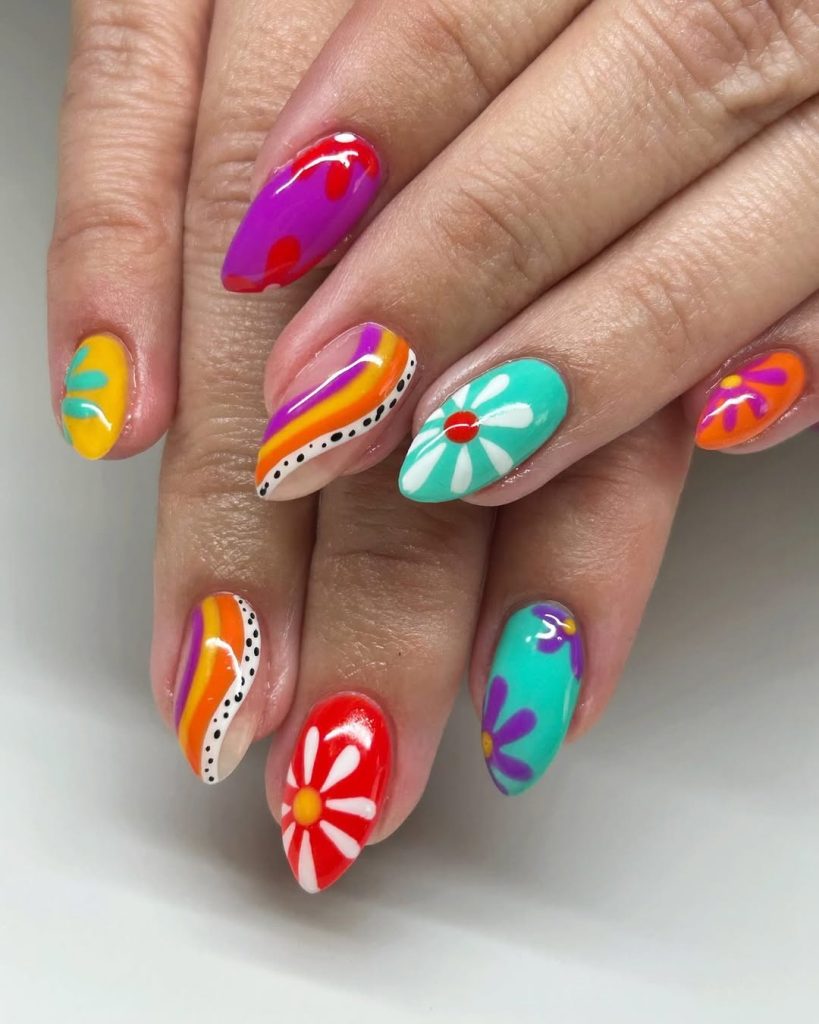 20. Colorful Almond Nails with Bold Floral Art and Mixed Patterns