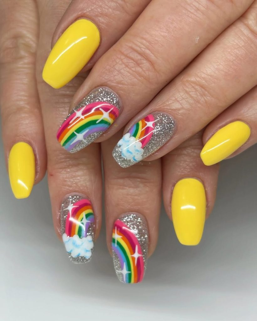 21. Yellow Almond Nails with Rainbow Art and Silver Glitter Accents