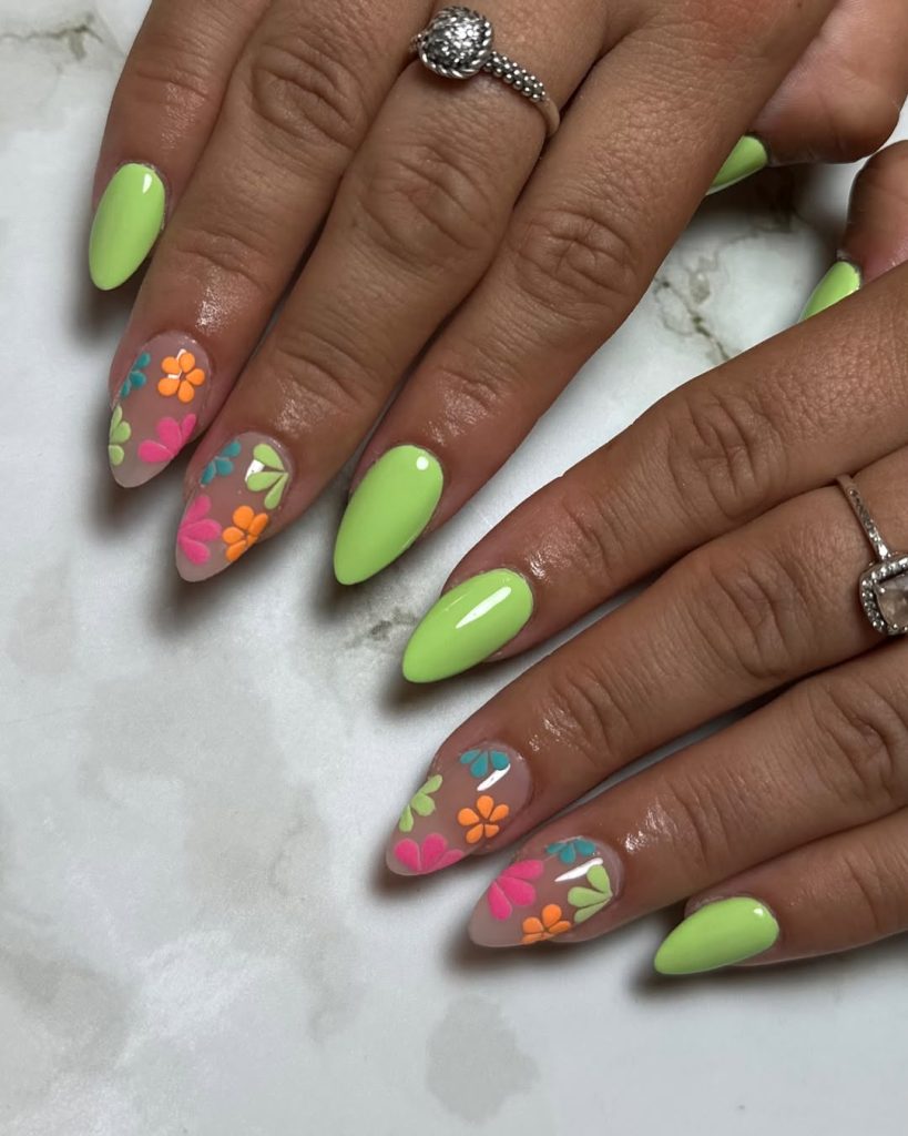25. Lime Green Almond Nails with Colorful Floral Art
