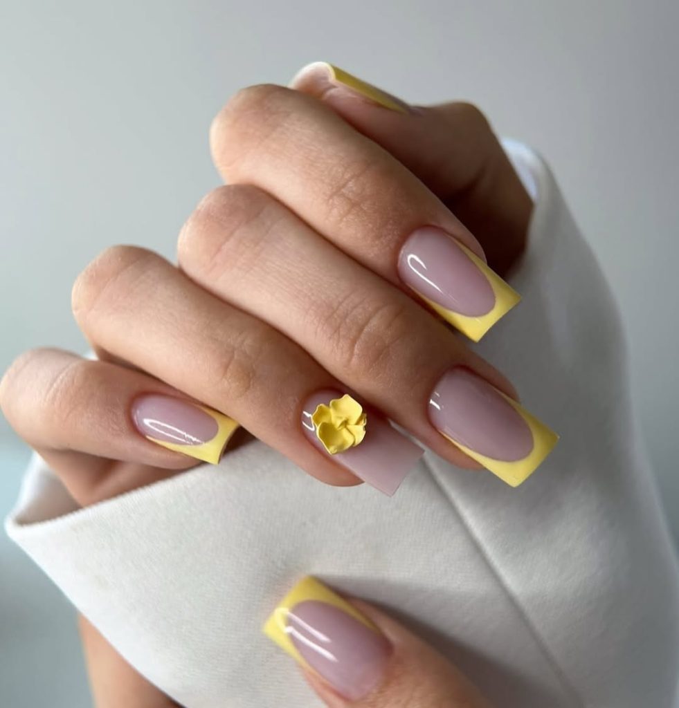26. Soft Nude Square Nails with Yellow French Tip and Floral Accent