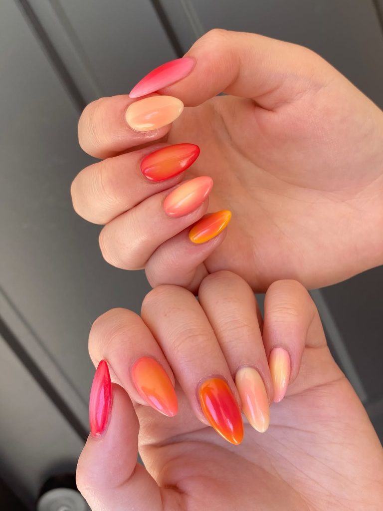 29. Warm Gradient Almond Nails with Sunset-Inspired Colors
