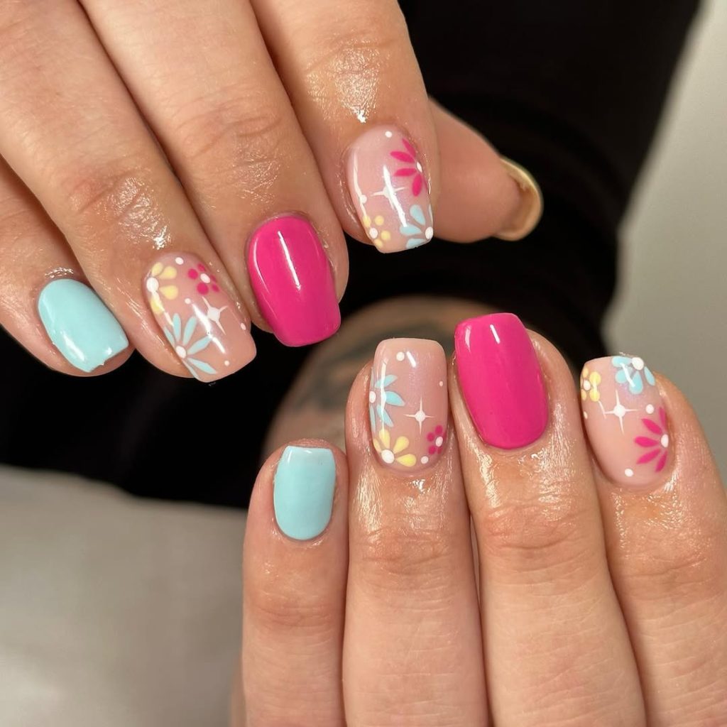4. Square Pink and Blue Nails with Delicate Flower Details