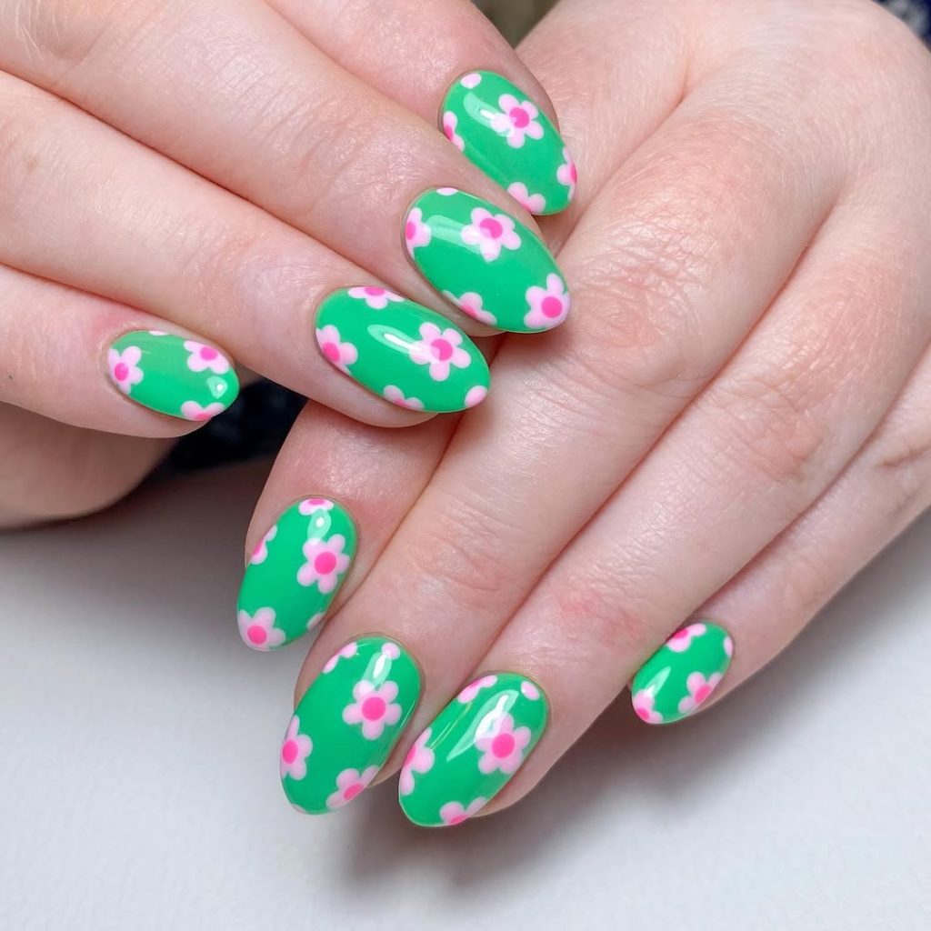 This design works beautifully for women who love almond nails and want colors that feel fresh but still wearable. The almond shape visually elongates the fingers, making it flattering on most hand shapes. If your nails are medium to long and fairly strong, this style holds up well. Keep the polish glossy and simple elsewhere so the floral art stays the star of your overall color palette.
