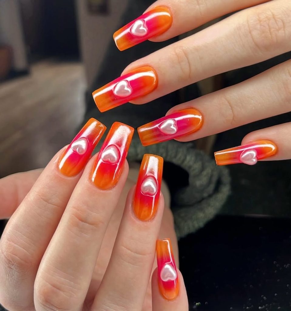 This manicure feels bold in the best possible way. The blend of neon colors fading from pink to orange instantly brings warmth and confidence, like golden hour bottled into a nail design. The glossy finish and raised heart detail add a playful, almost flirty twist that makes the look feel expressive and modern. It’s the kind of design that catches attention without asking for permission, perfect for stepping into spring with energy.