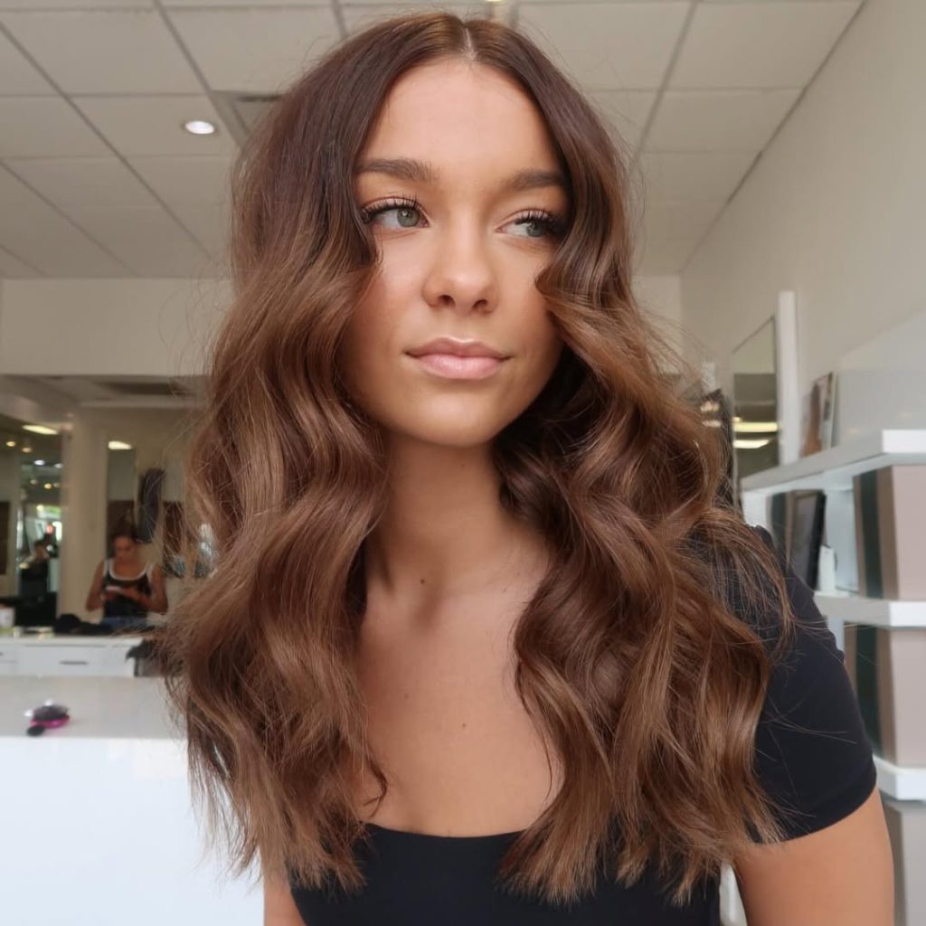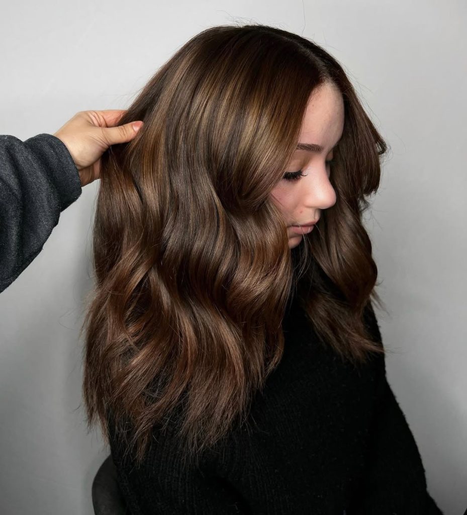 Chocolate brown loose waves have a softness that feels both glamorous and approachable. The waves add effortless movement, while the middle part creates a balanced, modern vibe. This hairstyle whispers confidence without trying too hard.