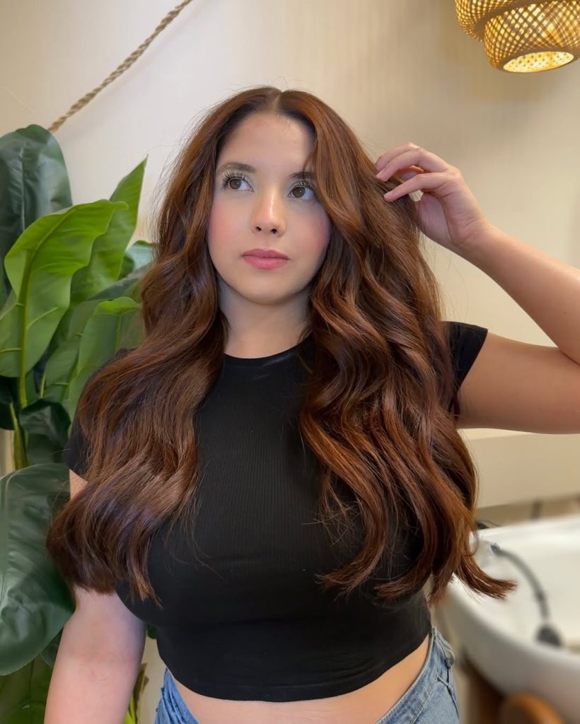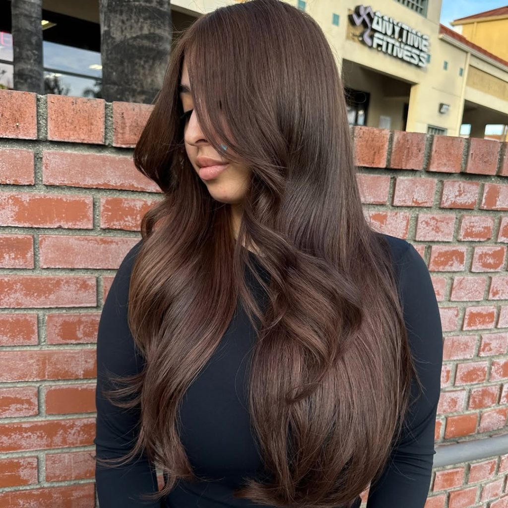 Long glossy chocolate waves styled with a deep side part radiate elegance. The cut has a youthful energy yet feels timeless, making it perfect for both casual days and more dressed-up occasions. It’s effortlessly flattering, with just the right amount of bounce.